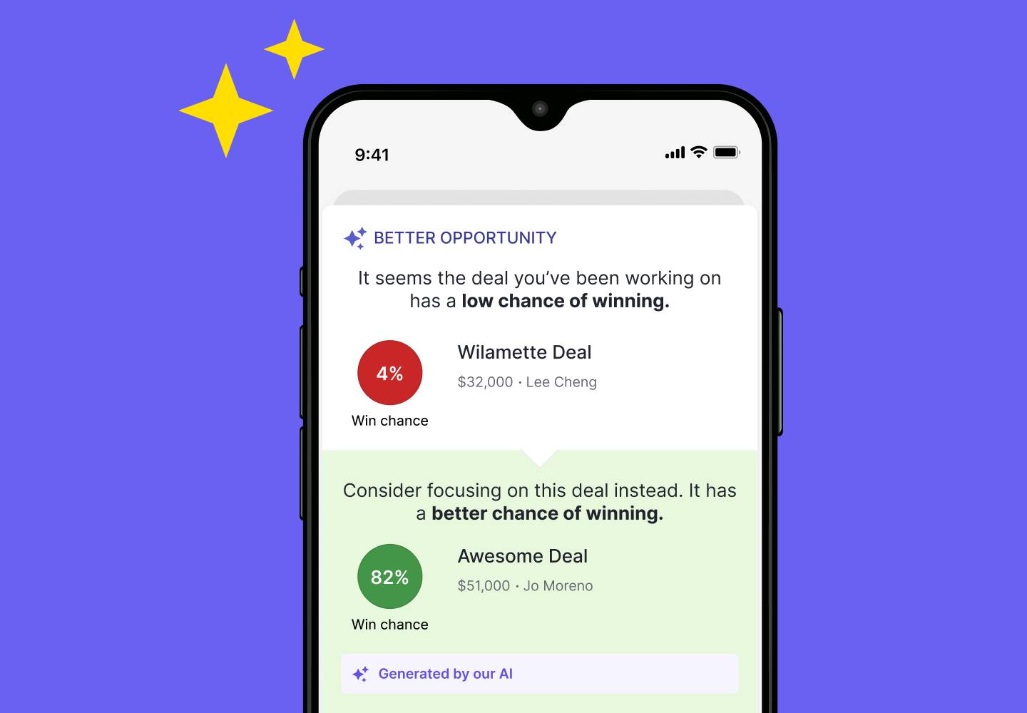The AI-powered Sales Assistant can predict deal win probability and recommend the next best actions to take, so you focus your efforts on the big opportunities