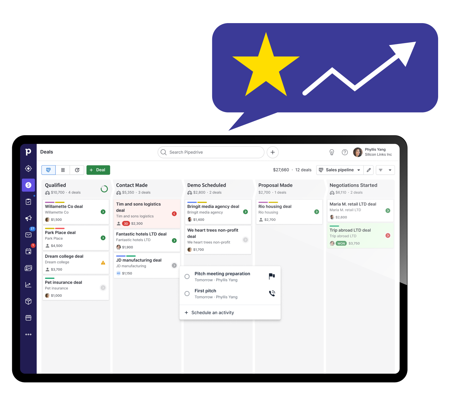 The sales CRM is a feature-rich yet easy-to-use tool. Pipedrive keeps you on track with your pipeline management activities, monitors important customer data and improves your business processes.